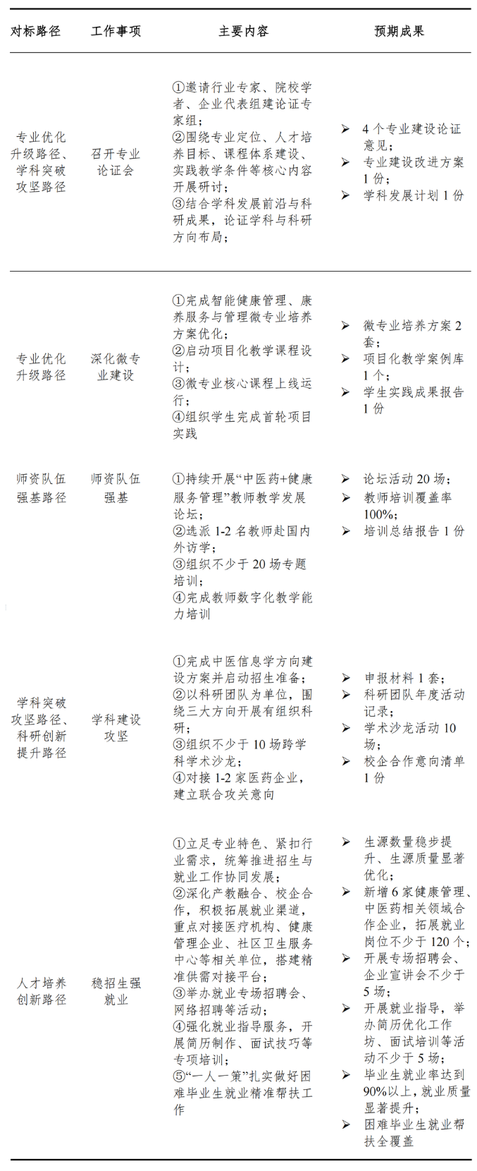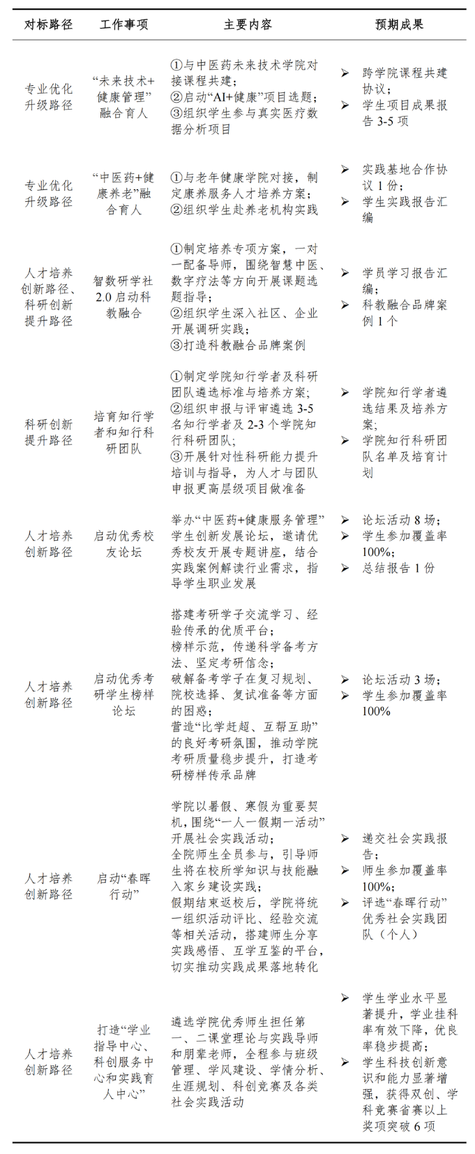 3.学科突破攻坚路径:重点打造卫生政策与管理、数字健康治理、健康服务与养老管理三大特色方向。推进中医信息学方向招生,积极筹备公共管理学专业硕士点申报,引进和培育3-5名学术带头人,形成1-2个省内优势特色学科方向。争取获批中医信息学方向研究生招生资格,并力争达标公共管理硕点申报条件。
