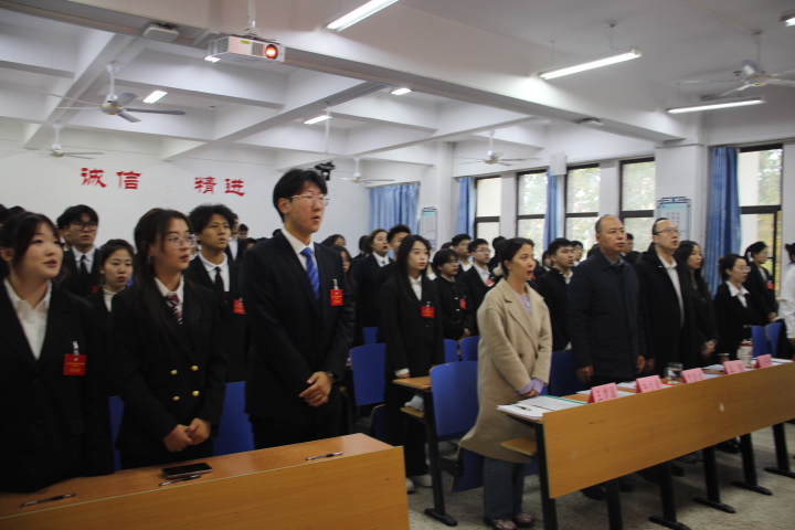 现场准备就绪,《义勇军进行曲》的激昂旋律在知行书院201教室奏响。全场人员应声起立、昂首挺胸,目光坚毅汇聚前方,会场庄严而肃穆。参会人员齐声高唱国歌,歌声铿锵有力、赤诚激昂,既为这场青春盛会拉开庄严序幕,更凝聚起全体学代会成员勇担使命、共赴新程的坚定信念。