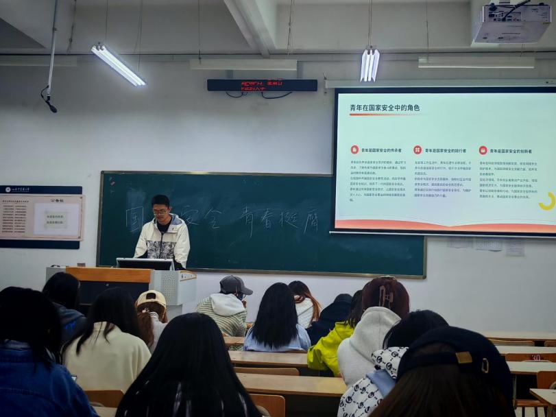 在此次团日活动中,团支书李倬佟在台上为同学们讲述了总体国家安全观,以及正值青年的我们该怎么做,才能让国家变得更加强大,更加繁荣昌盛。在活动过程中,团支书引导大家深入学习贯彻总体国家安全观,提升国家安全意识和素养,筑牢国家安全的青春防线,为强国建设、民族复兴贡献力量。